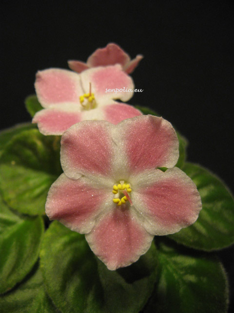 Huge, sdbl. deep pink thumbprint stars with large white centers and borders. Beautiful cream and green variegated foliage. Semiminiature #9466.