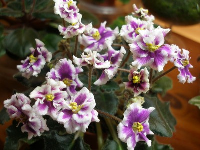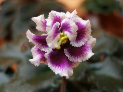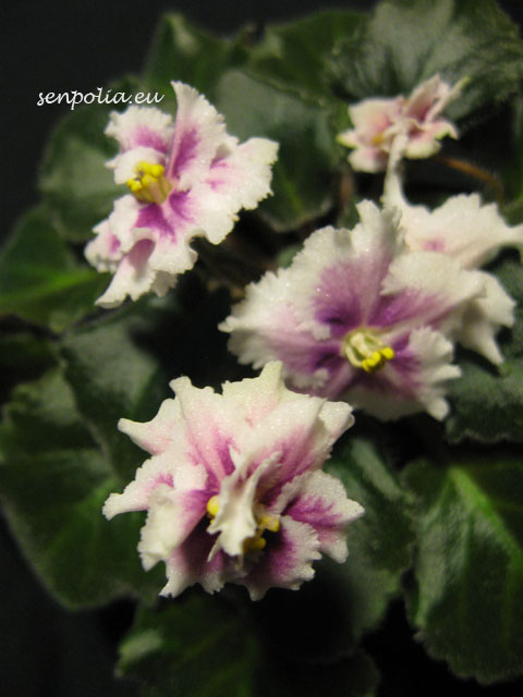 Rob's Boondoggle (7880) 06/02/1993 (R. Robinson) Semidouble dark red sticktite star/wide white ruffled edge. Dark black-green, wavy, serrated/red back. Semiminiature.
