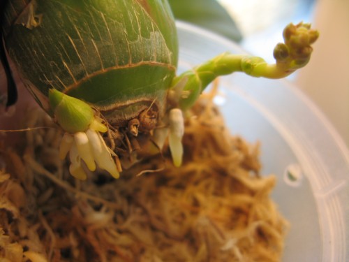 Так их и нет. Сейчас цветение закончится, пойдет новый рост и он даст корни.