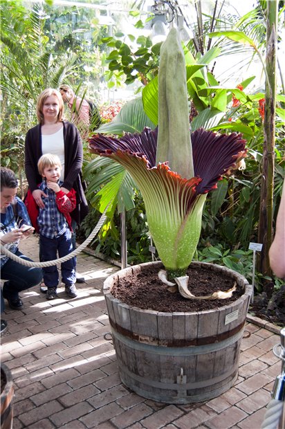 S zapahom vse preuvelicheno. Nu vonjaet nemnozko, kogda stojat sovems blizko k cvetku i to ne vsegda pahnet. Etot pochatok v seredine cvetonosa za den sam sebja nagrevaet na 10 gradusov vyshe, chem temperatura okruzhajuschej sredy i periodicheski vypuskaet svoi "aromatnye fljuidy". Takim sposobom on zavlekaet muh k sebe.