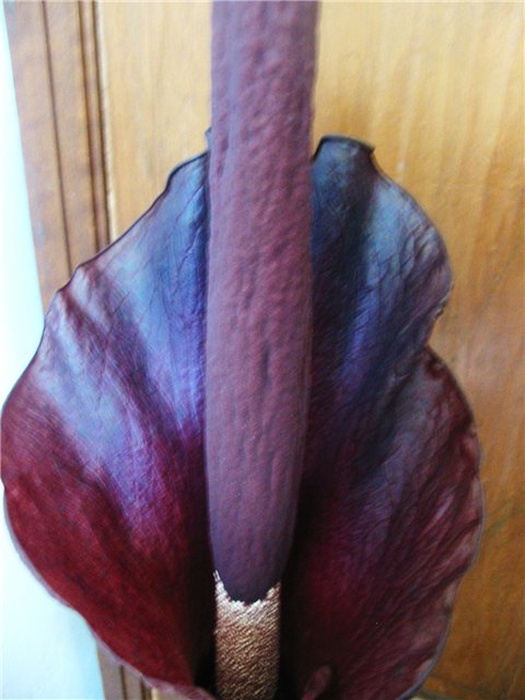 Цветок просто гиганских размеров! В конечном итоге он достиг 40 см (сам цветок)! Но,думаю это связано и с самим размером клубня и самого зеленого зонтика. Как я уже писала он у меня около 1 метра 60 или 70 см(я уже сама забыла) и клубень такой, как голова новорожденного (может чуть меньше, в любом случе в 2 большие мужские руки не влазит). Такого гиганта лично я больше нигда не встречала (можно ведь похвалиться, правда :).