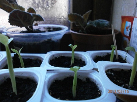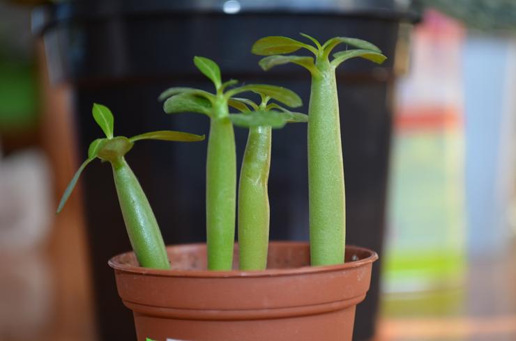 Вот мои, осенний посев. Зиму прожили на стеллаже с подсветкой. Из 5-ти семян 5 взошло. Покупала у http://www.sementes.de . Сорт Blood Diamond , бордовый должен быть. Но при посеве семян адениума нyжно учитывать, что сорт не всегда передается. Может получится традиционный обесум. Один сеянец уже вырвала и выкинула, он был деформирован почему-то. Еще один тоже с деформацией.  Скоро буду рассаживать, оставлю три здоровеньких. Попробую... Не знаю как взрослые растения, а эта мелочь водохлебистая. Если забываю полить, сразу морщатся.
