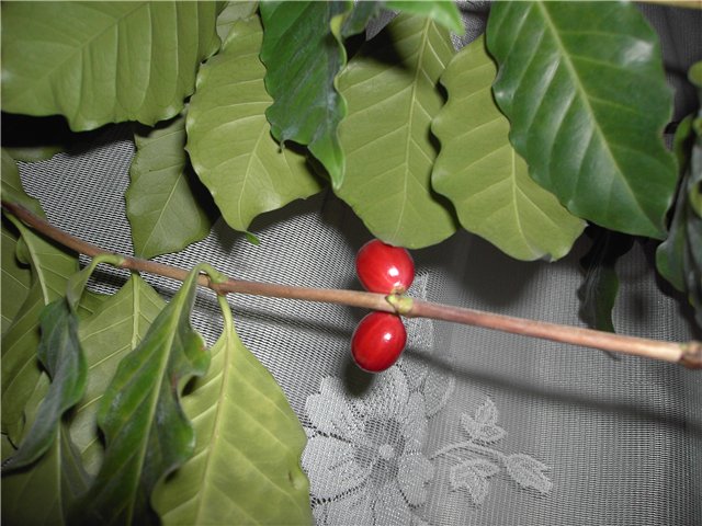 Внутри каждой ягоды находится по 2 половинки зерен - то, что продают как кофейные зерна. Первый урожай был 90 плодов. Жарить и варить кофе не пробовала, потому, что хотела все посадить. Но жарить их можно, единственно надо помнить, что они содержат кофеина в 3 раза больше, чем те, что продают в магазине. Цветет на 5 году, если выросло из семян. Все плантации в Индонезии, Бразилии, Колумбии выращены из семян. Причем дерево цветет после каждого дождя и на одной ветке бывают и цветы и зеленые плоды и красные. Летом плоды зреют недель 9-12. В прошлом году мое дало плоды в августе и они зрели до весны. С первыми плодами я, признаюсь, *прокололась*  - решила, что им надо дозреть и месяца 2 не сажала, так потом ничего не взошло. Только потом я нашла в очень старой книге информацию, что семена быстро теряют всхожесть и надо сажать сразу. В современных книгах и журналах об этом не написано, вот ведь противные авторы