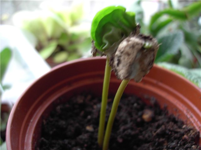 Кофейное дерево (Arabika sp.) растет у меня лет семь. Три последних года летом цветет и дает плоды-красные ягоды. Из первого урожая уже выросло деревце. В конце февраля посадило еще одно. Всходят семена долго, теперь видно как из половинок *бобов* растут листики.