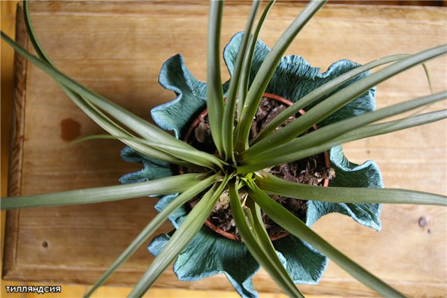 В умной книжке было написано следующее:многие тилляндсии - эпифиты;они не нуждаются в земле и отлично растут на куске коры,деревяшке или в трещинах скал.Однако тилляндсия синяя(это что я купила) - нетипичный представитель из этого рода:у неё полноценные корни,она хорошо растёт в земле и при этом красиво цветёт.Используйте грунт для бромелиевых,который хорошо пропускает воду.