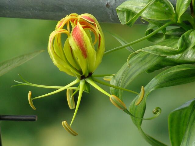 Семейство лилейных. Родина - влажные тропические леса Южной Азии и Африки. Красивое клубневое растение в культуре представлено видом Глориоза роскошная Gloriosa superba. Многолетняя лиана с побегами, требующими опоры. Листья светло-зеленые, очередно расположенные, узколанцетной формы, на конце спирально закрученные наподобие усиков. Цветки одиночные, крупные - до 10 см длиной. Длинные лепестки ярко-красные, с желтым волнистым краем отогнуты назад к цветоножке.