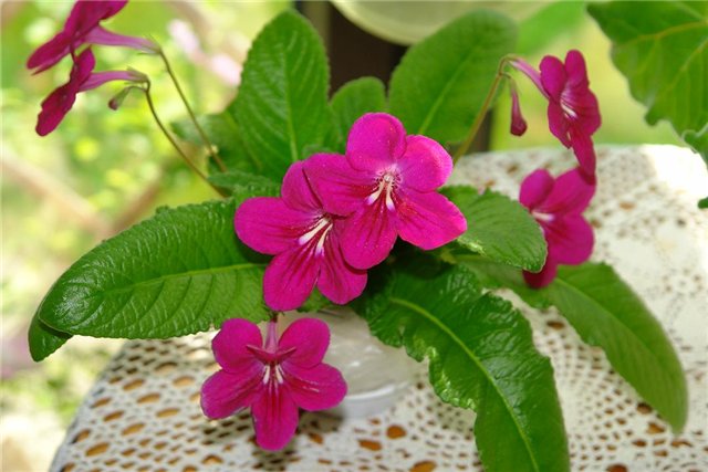 (Oglevee catalog) Especially showy with red purple flowers marked by darker stripes accented by two yellow stripes. Compact-medium growth habit. (AGGS Register)