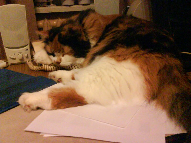 Кошка дремлет рядом со мной у компьютера, а кот пошел место греть