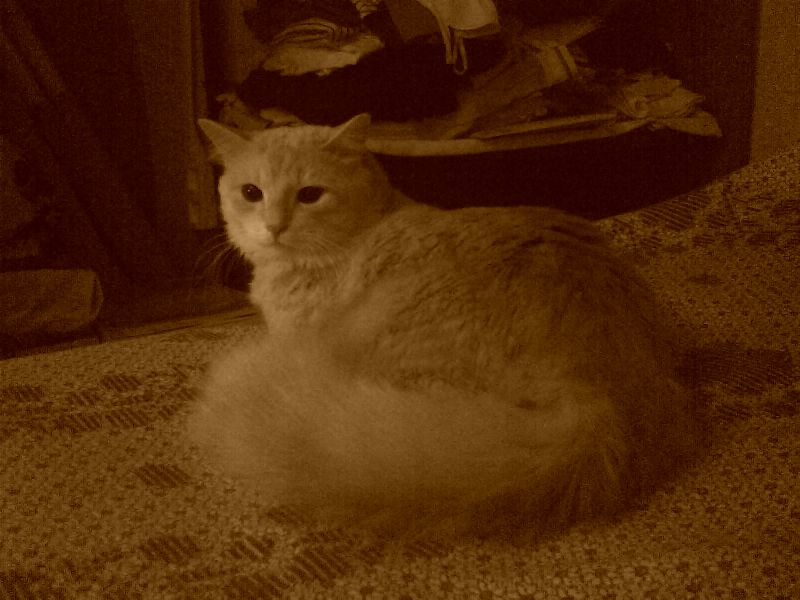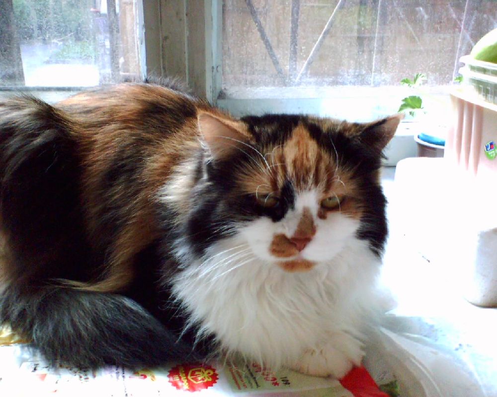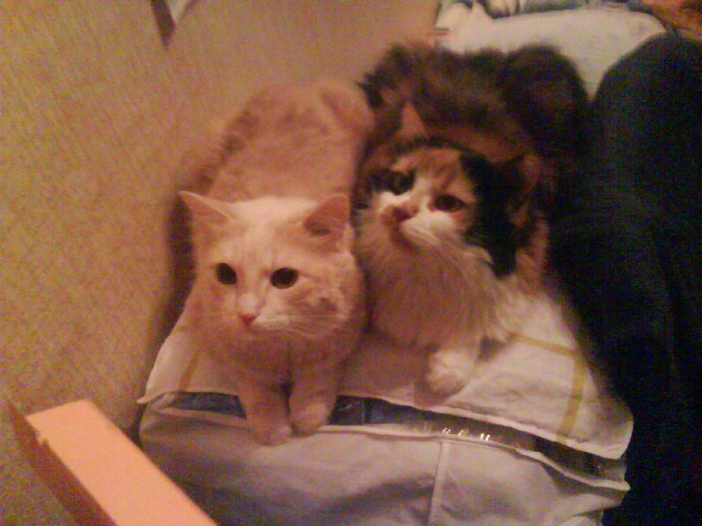 Светлый "персик" - кот Нильс. Трехцветная - кошка Кнопочка. Настолько благородное животное, что почти за 10 лет ни поцарапала, ни обшипела никого (один раз, по молодости, позволила себе пошипеть - соседка пахла собственной кошкой). Оба животных - полноценные, но был всего лишь один котенок, как папа, но, увы, не выжил