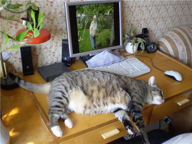 Ну и пуз!  Такой откормленный товарищ! Конечно ему лениво бегать и прыгать, лежать около тёпленького модема на много приятнее.