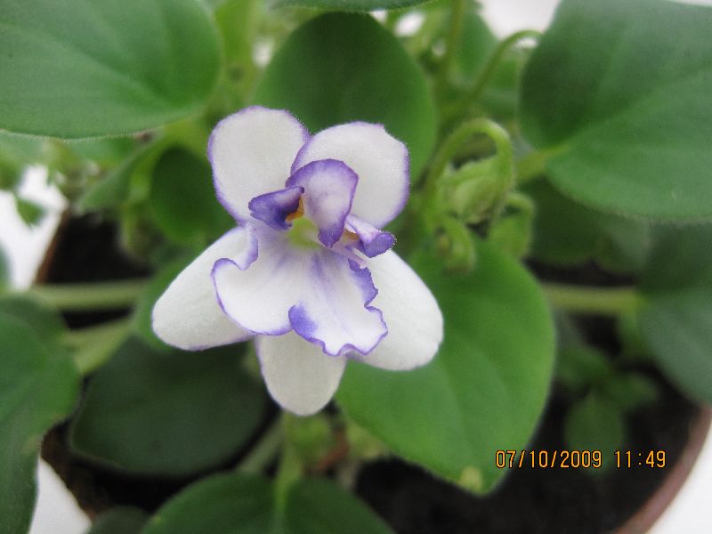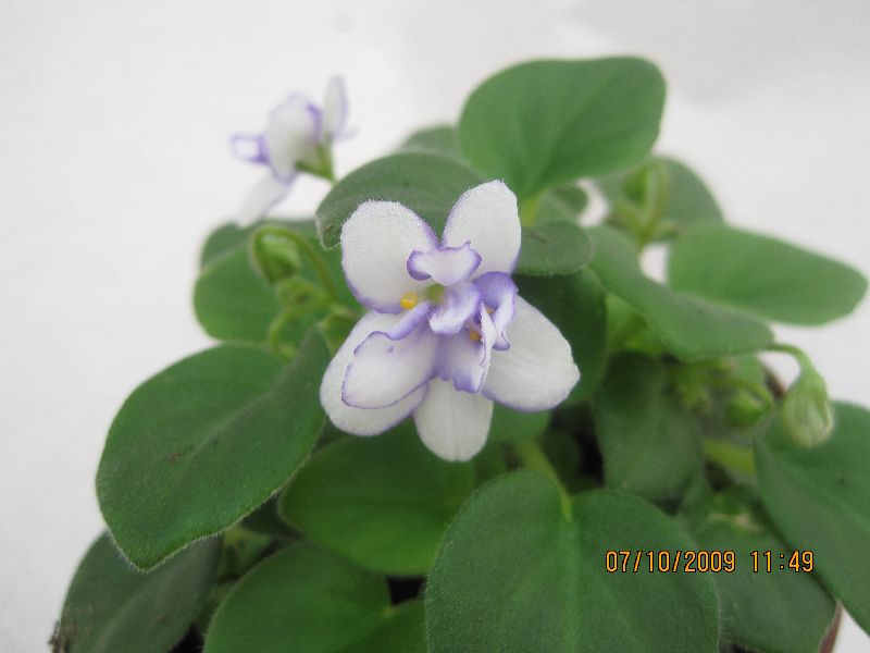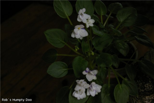 Rob's Humpty Doo. Striking sdbl. white with blue side stripes. Medium green. somewhat glossy foliage. Very heavy bloomer. Semimini chimera #8456.