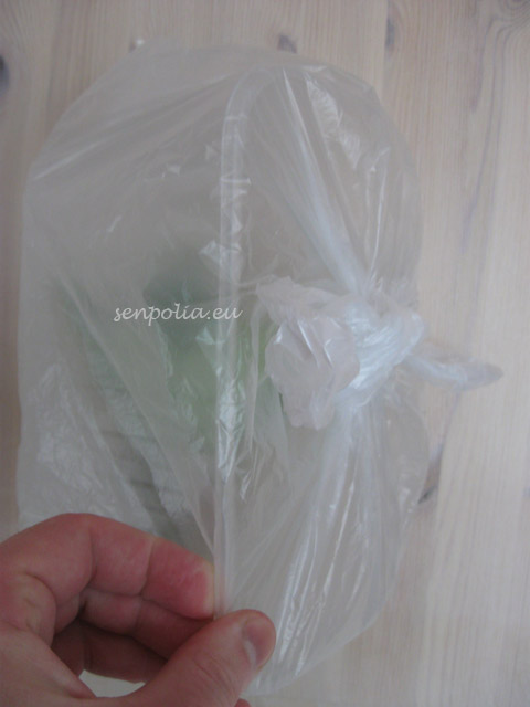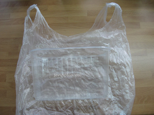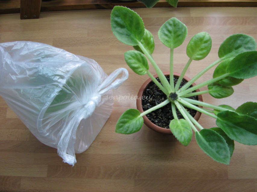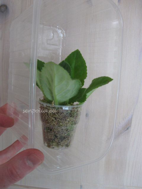 После посадки нужно сделать тепличку. Я использую коробку из под киви и пакет. Во- первых растение не касается стенок, значит влага не попадет на листья и лист не начнет гнить. А во-вторых такую тепличку не надо проветривать каждый день и пакет можно не очень туго завязывать, что дает возможность обновлению воздуха внутри. Ставим тепличку в теплое место, но мой вам совет, не надо ставить туда где снизу идёт тепло -растение может загнить. Потому что получается как =кастрюля на газе= и больше образуется влаги нa стенке. А это не желательно . Место хорошо выбрать где температура равномерная и свету не так много. Это заставит укорениться быстрее растение. И у нас получается после такой операции 2 растения, которые теперь будут по разному расти. Еще раз скажу. Растение должно быть хорошо развито,так- как в момент такой процедуру ломается много листьев, и как вы не делали все аккуратно все-равно будет потеря листьев.