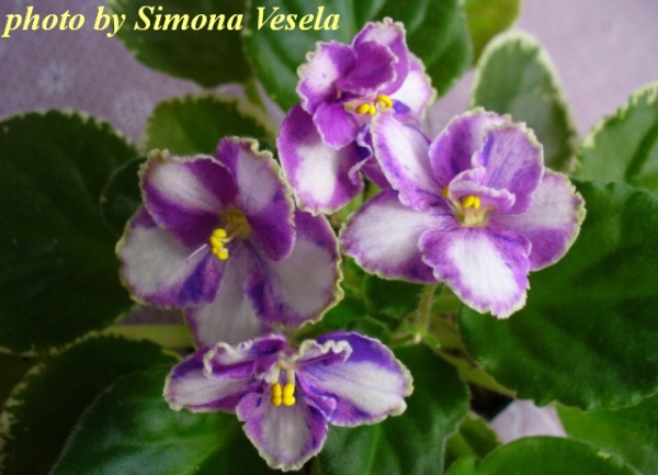 Ma's Mardi Gras (Robinson): Very pretty and striking! Lavender-blue fantasy pansies with white pinwheel stripes, slightly ruffled, often greenish edge. TL variegated foliage. AVSA#9694