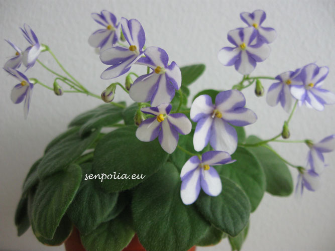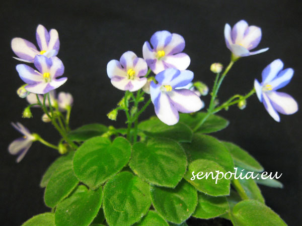 Маленькие сине-лавандовые цветки с белой полосой по центру лепестков. Листья средне-зеленые, округлые, стеганые, с заостренными кончиками. Розетка ампельная мини. Химера.