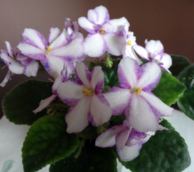 White, single chimera and semidouble pansies, have side stripes of pink with each stripe being flecked with blue fantasy. Medium green, standard foliage