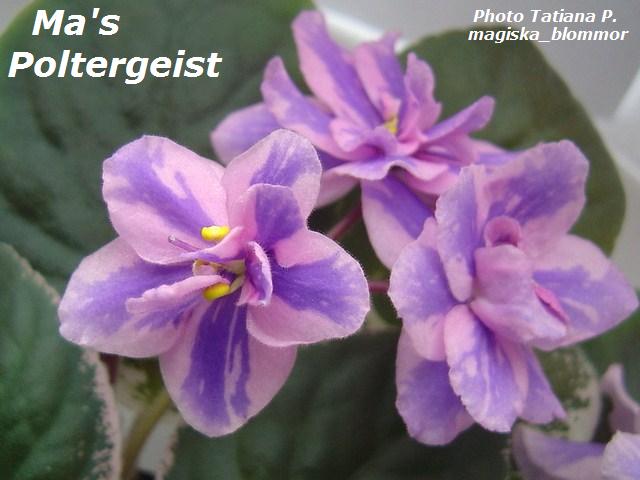 Ma's Poltergeist (Robinson): Dbl. pink pansies with medium purplish-blue splashed center stripes. Dark, TL variegated foliage that shapes well for show. AVSA#9697