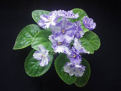 King David. Large sdbl. frilled blue stars with white pinwheel stripes. Medium green, quilted, scalloped foliage. #8782 (Thompson)