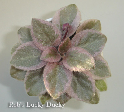 Описание с сайта Робсов. Rob's Lucky Ducky. Sdbl. dark rose-pink pansies. The most beautiful sea-foam green, white, and pink variegation that stays heavily variegated no matter age or heat! Very rare, "leaf" chimera, propagated true only by sucker. A slower grower than others, but the most colorful, exquisite foliage. Semiminiature.