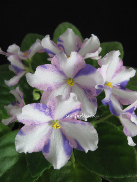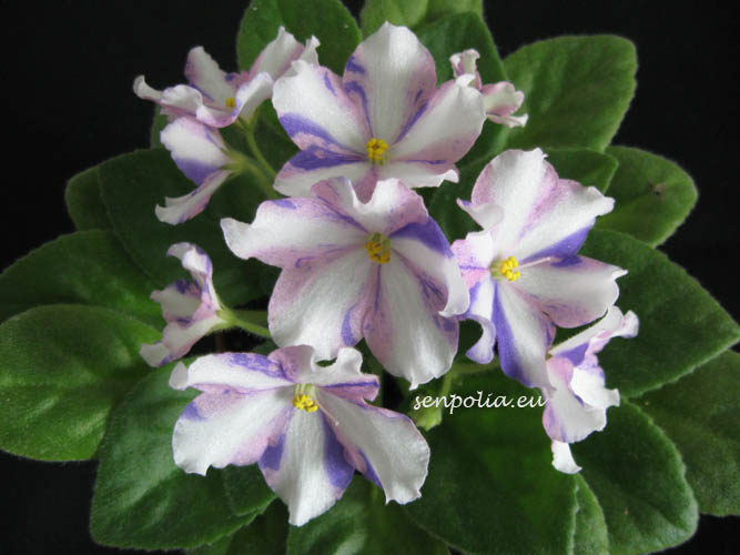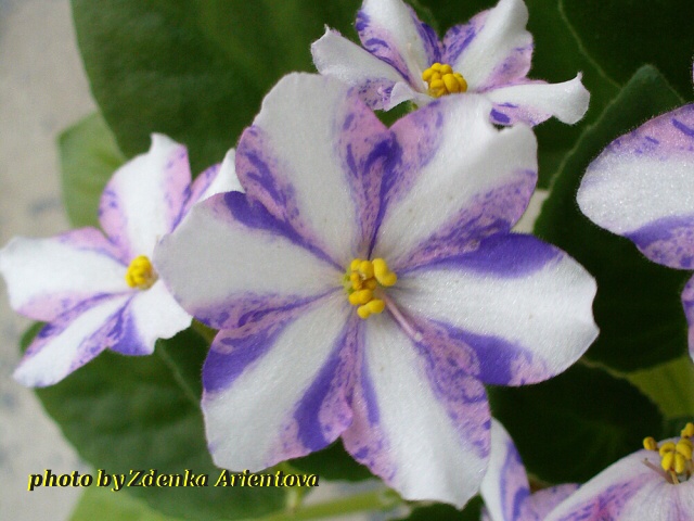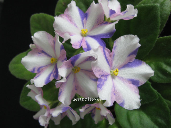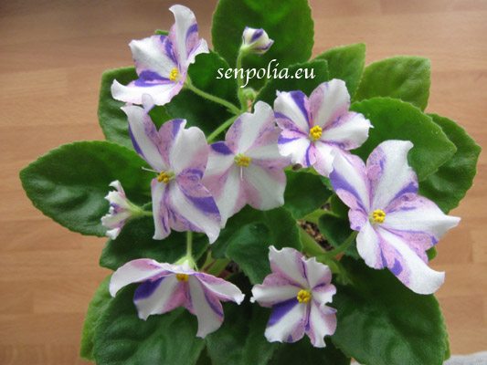 Простые-полумахровые розовые звезды с сине-пурпурными полосками и фэнтази, белая полоса по центру лепестков. Среднезелёная листва. Стандартная розетка.