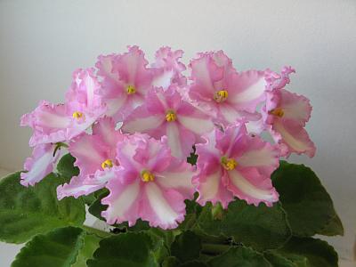 Стандарт. Крупные полу махровые розовые анютины глазки с волнистыми краями и ослепительно-белыми полосами от центра к краю. Средне-зеленая листва.(http://www.donnaflora.ru/main.cgi?catalog=695)