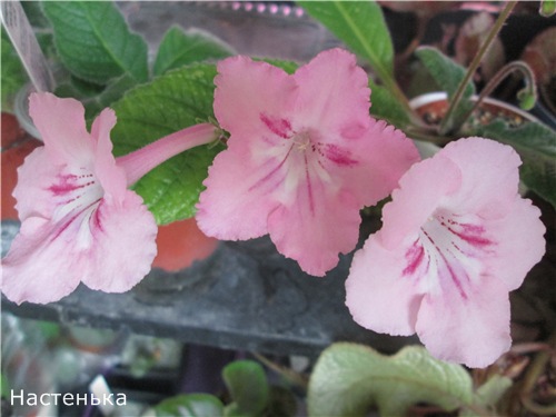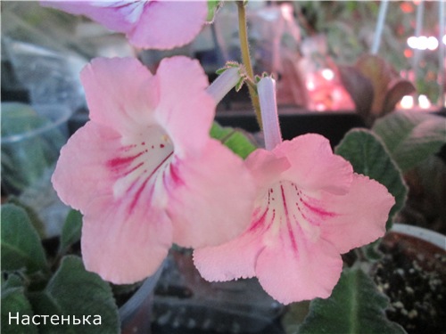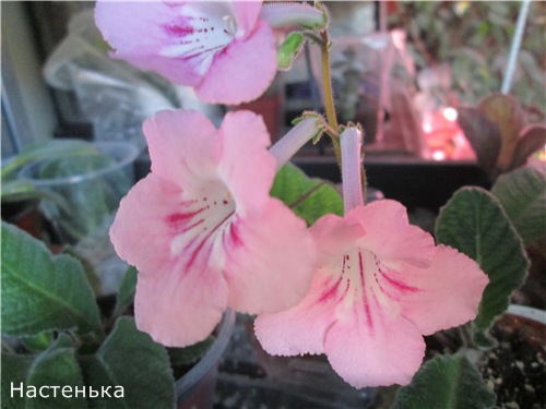Первый - нежно-розовый с белым горлышком и темно-малиновыми полосками. На цветоносе 3 цветка, цветоносы прямостоячие, цветки некрупные - 4,5 - 5 см, цветки держатся долго. Предварительное название -*Настенька*