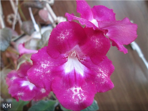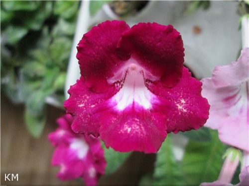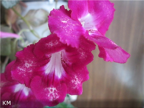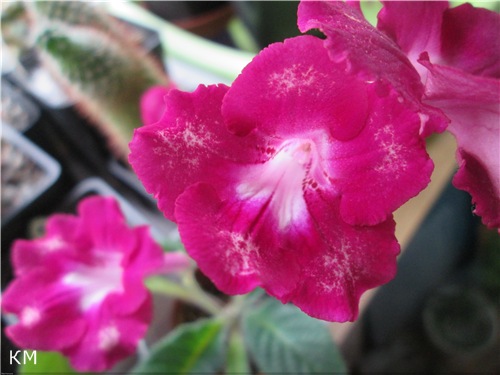 Второй гибрид- малиновые цветки с белым горлышком и с белым *крапом* посередине каждого лепестка. Самый первый цветок был с белыми пятнами на нижних лепестках. Цветки держатся долго, не выцветают. Окраска необычная, есть идея попробовать получить на малиновом фоне более крупные белые пятна-горошки посередине каждого лепестка (поэтому опылила цветки). Окраска напоминает *деревенский* ситец, поэтому название гибрида - *Катерина Матвевна* :D