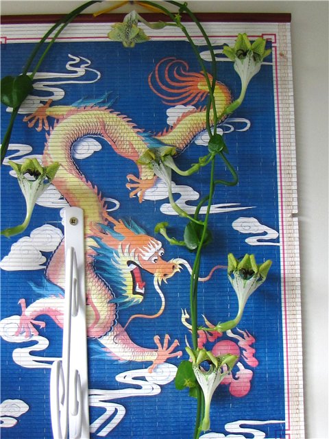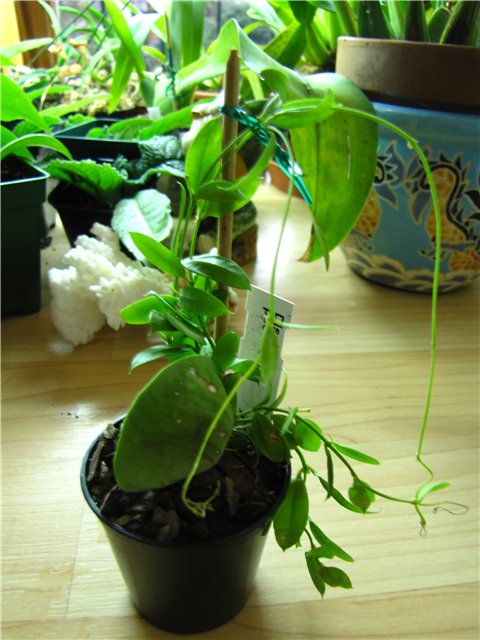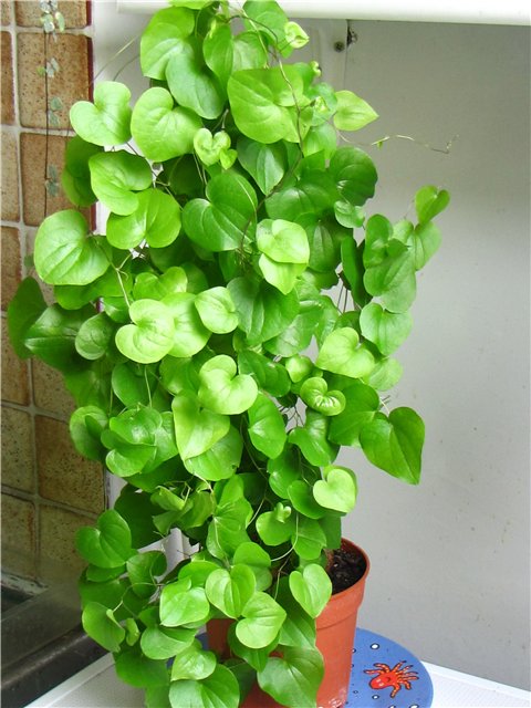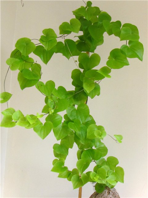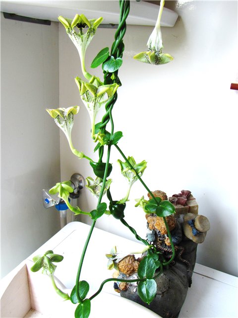 Растет в маленьком горшке, а плети наматываю на подпорку. Вот мы какие уже: