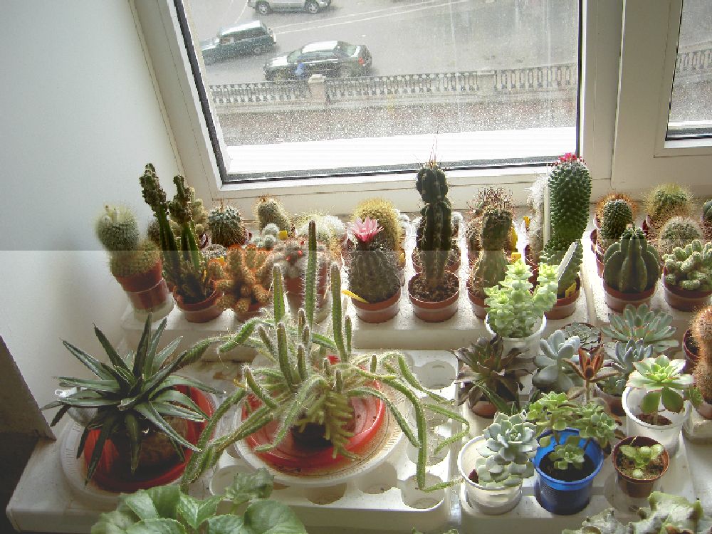 Да, эти кактусы растут на солнечной стороне канала Грибоедова - будете в Питере, милости прошу в гости! А поливаю я их... страшно сказать... Вот с октября они не поливались. В марте я их опрыскаю сперва - промою устьица, потом полью немного первый раз, на второй раз пролью обильно, а через две недели протравлю Актарой, чтобы не допустить появления мучнистого червеца (он как раз просыпается после зимовки и начинает искать среду обитания). Дома у меня не так светло, и некоторые кактусы вытянулись, Я их обрежу, они обрастут новыми детками, а старенький ствол я выброшу.