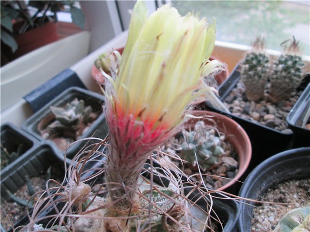 Мой кактус имеет возраст около 6 лет. Бутоны появились прошлой осенью, на время зимовки затаились, теперь спобобился зацвести. Цветок огромный. Как у всех астрофитумом, недостаток - цветы долго растут, но в раскрытом состоянии сохраняются недолго- дня 3-4.