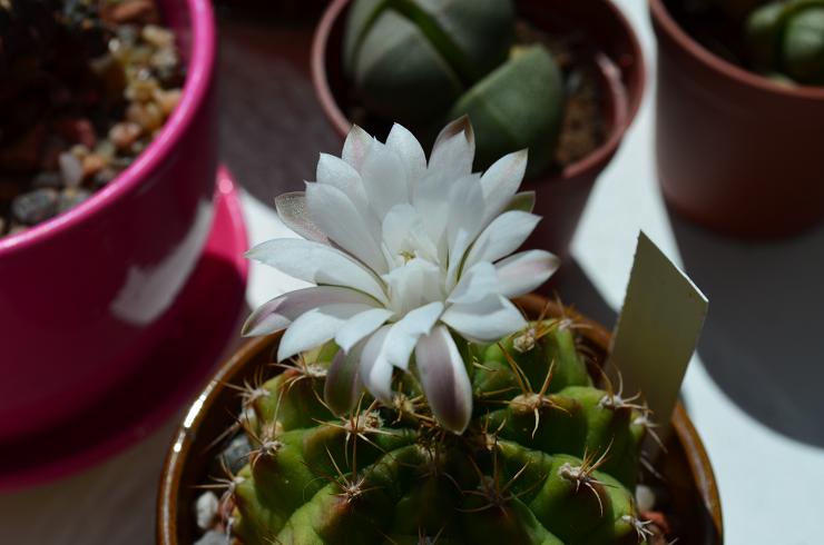 У меня тоже есть немного кактусов и суккулентов... Вот новенькая Lobivia Pampana, моей заслуги тут никакой, приехала уже с бутончиками. И вот он первый цветочек.