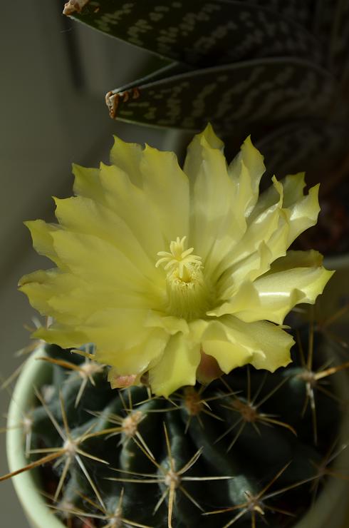 Последний в этом сезоне, безымянный кактус. Порадовал лимонным цветочком.