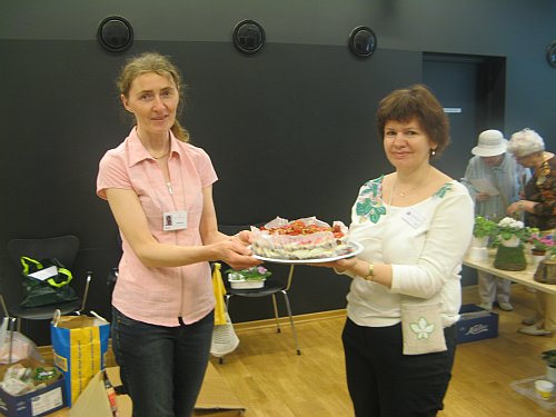 А так же кураторы выставки из администрации ботанического сада пришли нас поздравить с успешной выставкой, поблагодарить за интересную экспозицию, и предложили сделать выставку традиционной. Нам был вручен клубничный торт ручной работы. Очень красивый и очень вкусный. Со своей стороны и устами Ларисы мы тоже поблагодарили их за доверие, доброжелательность и всяческое содействие и передали несколько редких геснериевых для коллекции ботанического сада. Еще раз хотим поблагодарить Урмаса, Кристу и Тайми!