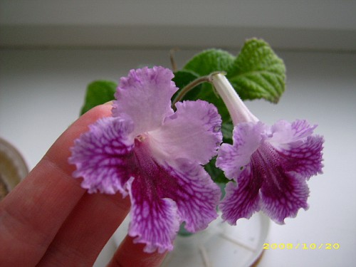 Описание из сайта http://www.streptocarpus-info.com/tablec.html (David Thompson) (Burgundy X Bristol's Petticoats), 2003 (2.25" light lavender with dark violet venation and solid dark violet throat; upper lobes lighter than lower ones, giving bicolor effect).