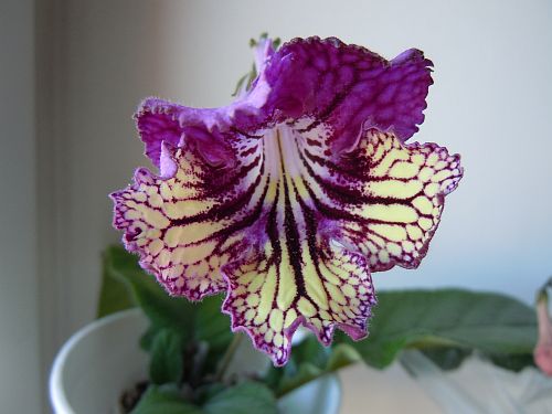 Два верхних лепестка - сиренево-фиолетовые с темно-фиолетовыми прожилками, нижние - желтые с сиреневой каймой и с кружевной фиолетовой сеточкой.