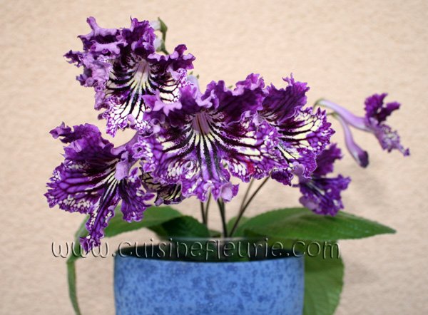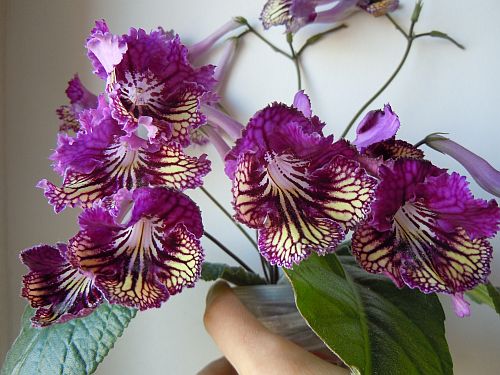 Насыщенно-фиолетовые цветы с венозным рисунком на нижних лепестках.