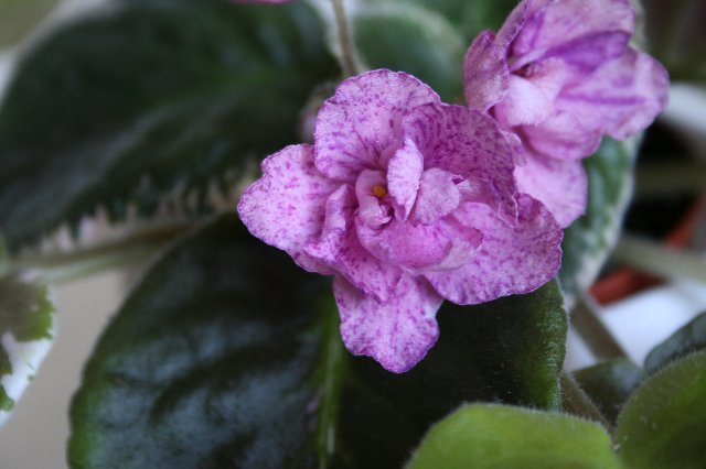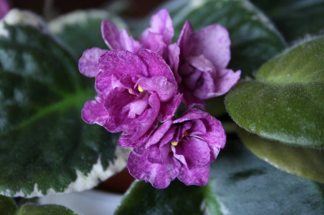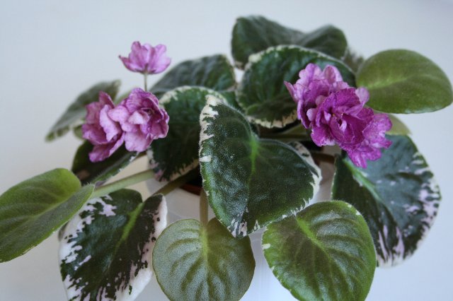 Semidouble mauve-pink frilled pansy/purple and raspberry fantasy. Variegated dark green, pink and cream. Large.