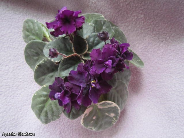 Apache Shadows (J. Munk) Double dark red-purple frilled. Variegated green, pink and white. Standard.