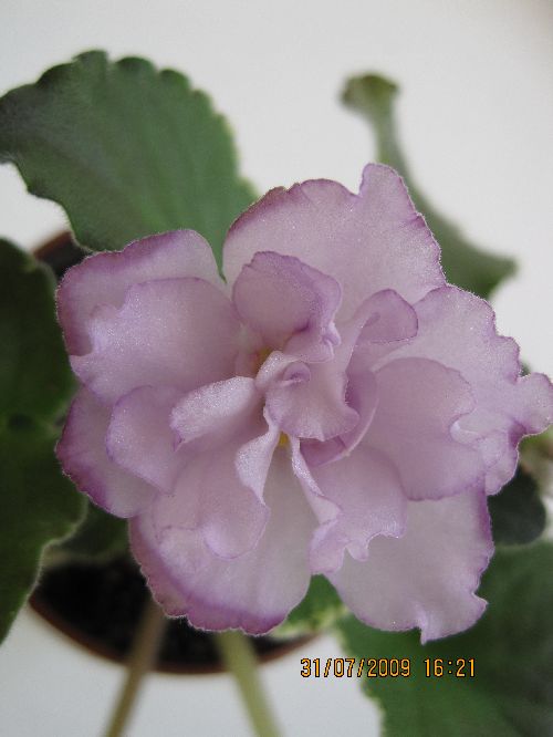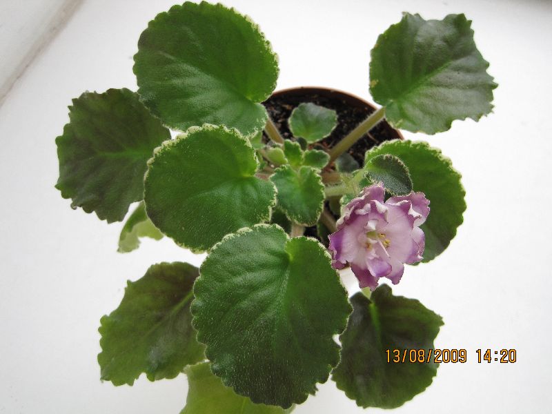 Buckeye Blushing. Огромные полумахровые и махровые нежно-лавандовые «анютины глазки» с гофрированными краями лепестков. Яркая темно-лавандовая кайма с темно-пурпурным крапом. Пестрая темно-зеленая с розовым и кремовым плоская стеганая зубчатая листва. У меня этот сорт был выращен из цветоноса с такими вот прилистниками от розетки Елены Сборщиковой.
