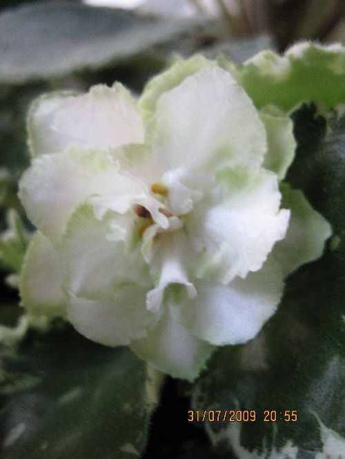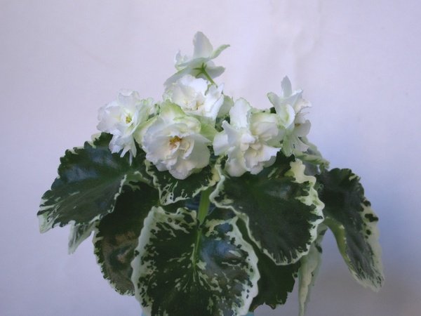 Кремово-белые махровые звезды с зеленой выемчатой каймой. Стеганые зубчатые листья с зелено-кремовой пестролистностью.