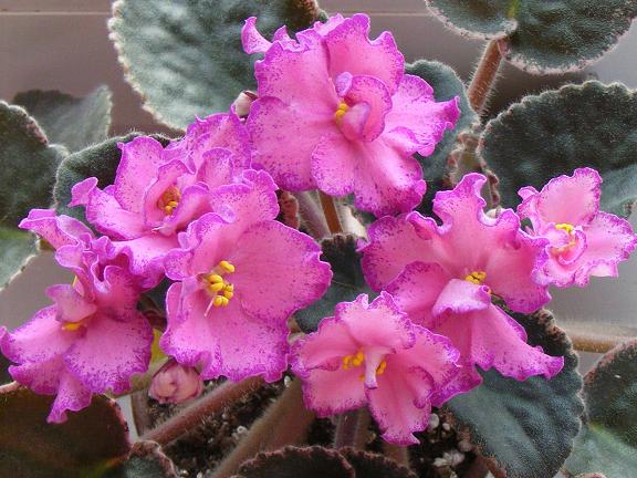 BUCKEYE COLOSSAL (9059) (P. Hancock) Semidouble peach-pink ruffled star / red sparkle edge. Variegated dark green, pink and cream, plain glossy, serrated / red back. Large.