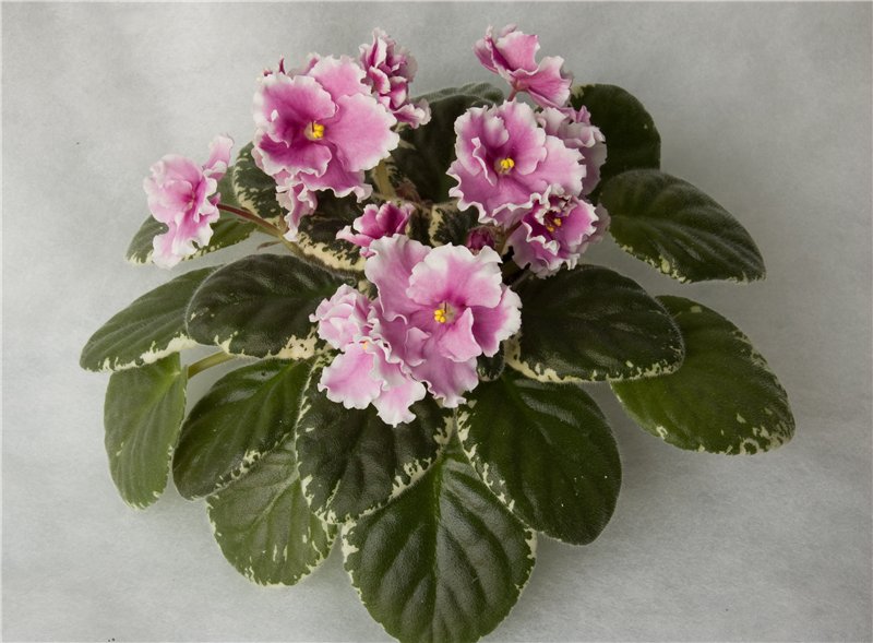 Полумахровые розовые с бордовой серединкой цветки, по краю белая гофрированная оборка. Листья стеганые. Пестролистник - зеленый с белым.