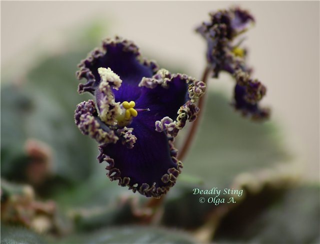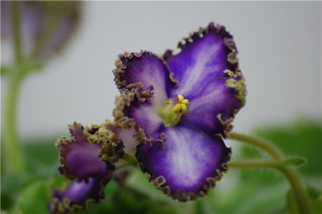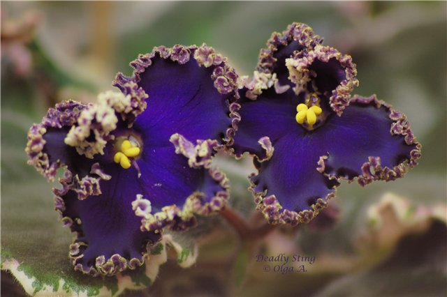 Крупные махровые удлиненные сине-пурпурные цветы с оборчатыми краями и широкой темно-зеленой каймой. Зелено-белая волнистая листва.