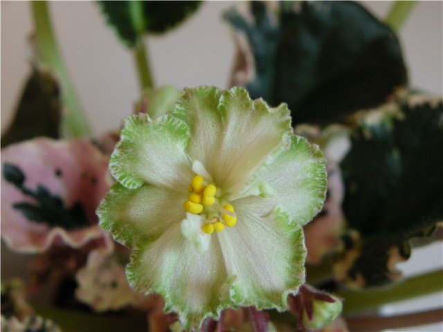 Ma's Frog Land #9131 O. Robinson Semidouble white star/green edge. Variegated light-medium green and white, pointed. Standard.