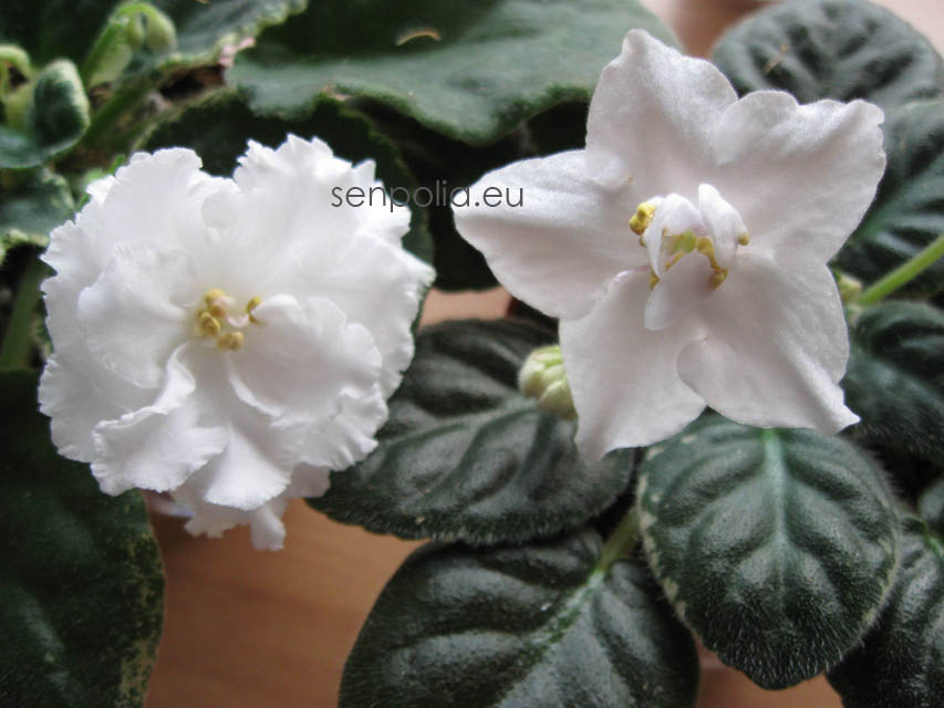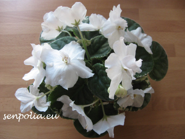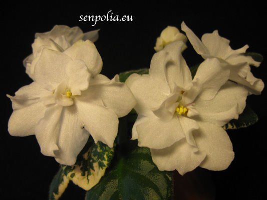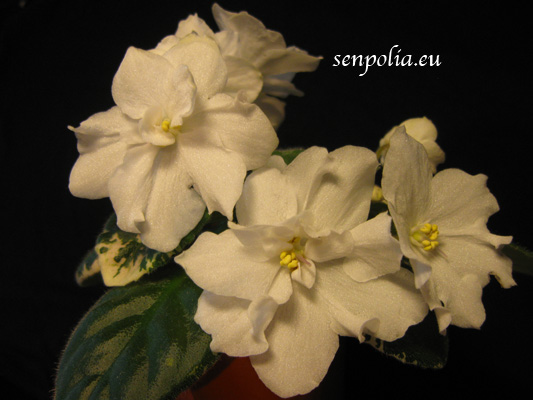 Описание: Крупные, ослепительно-белые (с синевой) , простые и полумахровые звёзды-колокола с удлинёнными лепестками нарядным букетом покрывают очень тёмную, компактную, пёструю листву.