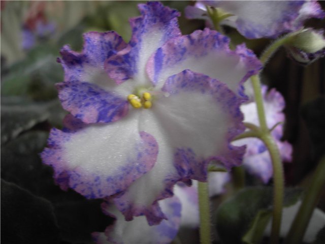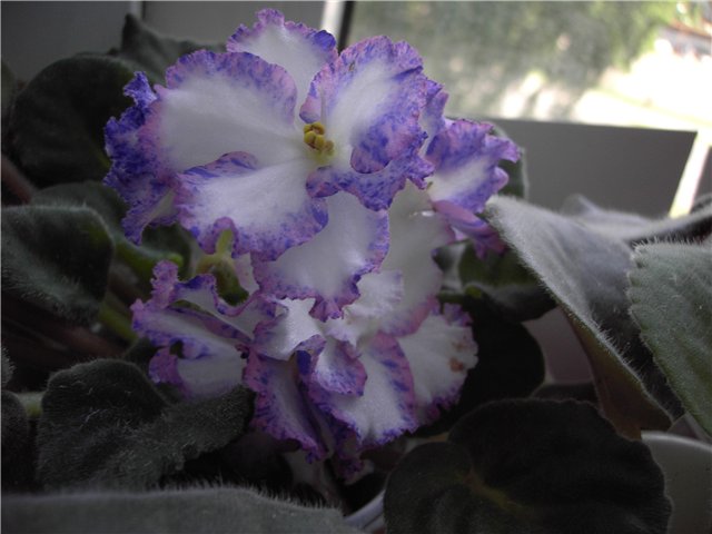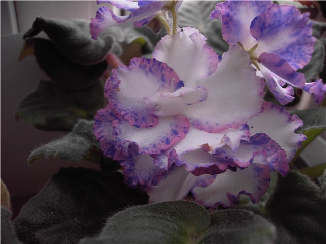 Улучшенный вариант первого *Modern Talking*, цветы действительно держатся долго, кайма достаточно широкая и яркая. Похожая кайма должна быть и у сорта Winter Parasol, но у него очень плохо передается расцветка, во всяком случае у меня из 8 розеток от разных источников только одна была правильной. Похожий новый сорт выставлен Н. Андреевой на ее сайте, но тот блекловат. А вот Modern Talking Gold с *химерной окраской* вероятно все же действительно химера, у меня все розетки дали простые синие цветы.