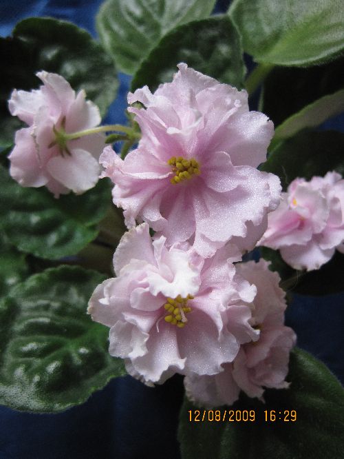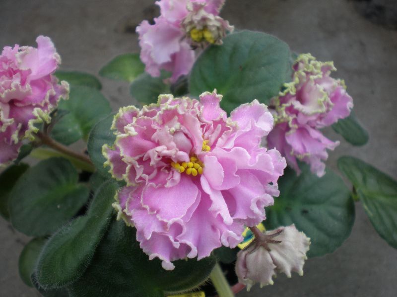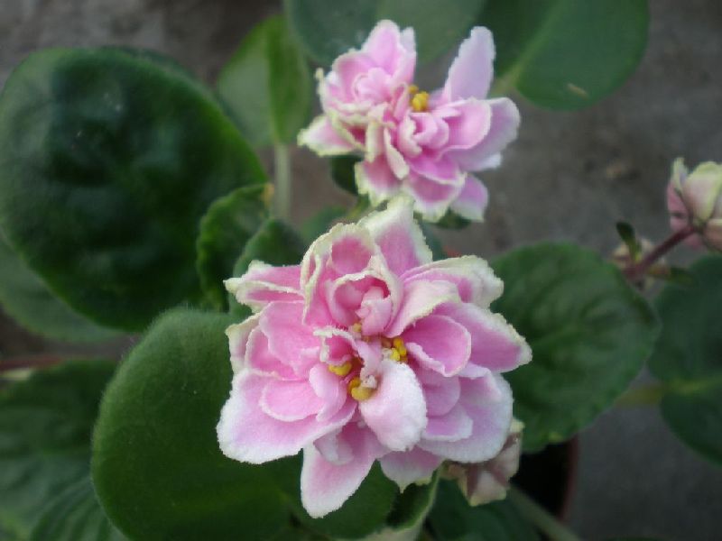 Цветки крупные, махрово-бахромчатые нежно-розовые с переливами двух тонов. По краю лепестка – тонкая салатная бахромка в прохладных условиях. Лист зеленый округлый, слегка удлиненный. Розетка стандартная.