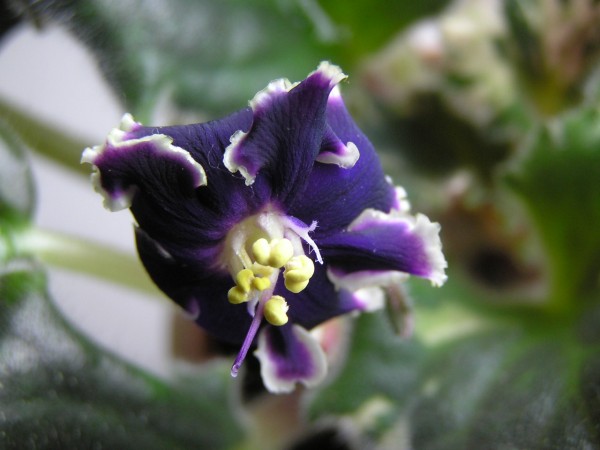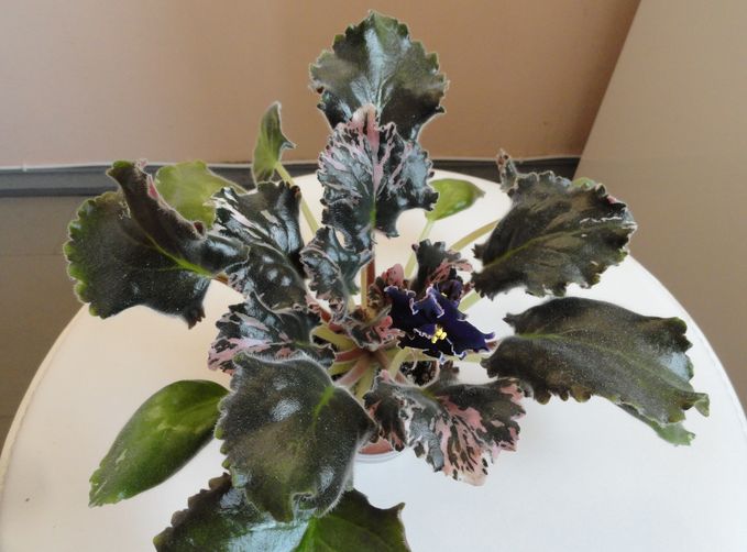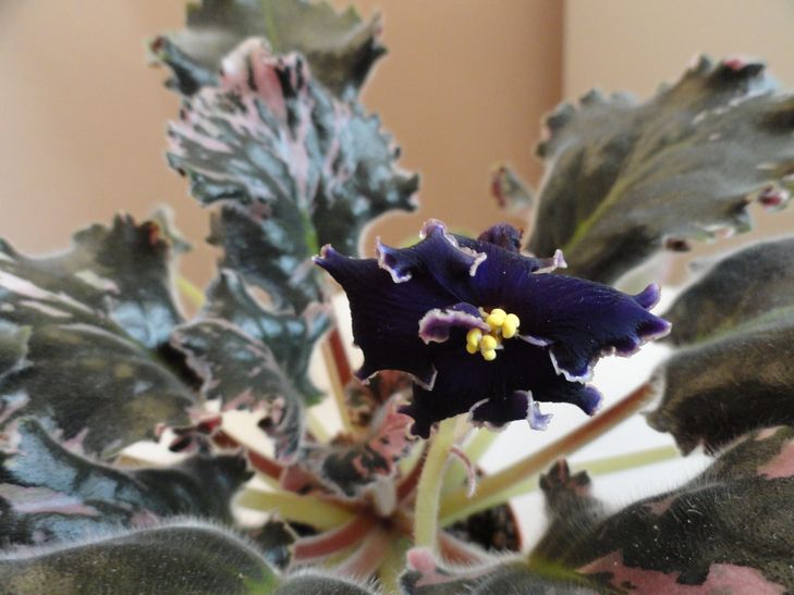 Тёмно-синие бархатистые цветы с почти чёрными кончиками лепестков. Тёмный пестролистник с бахромчатыми листьями. Стандарт.
