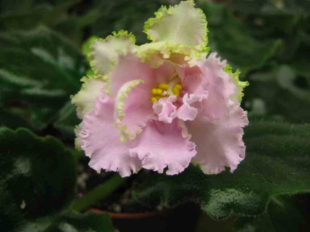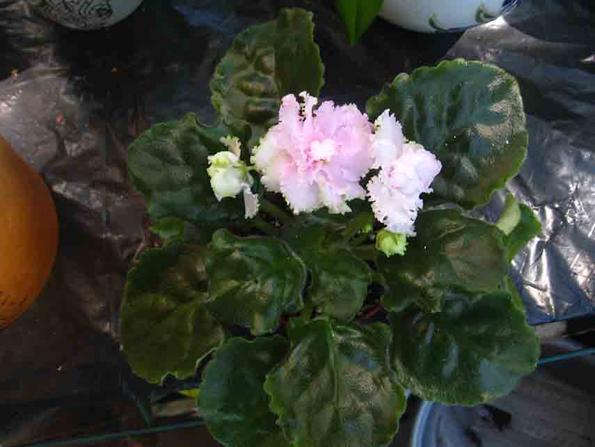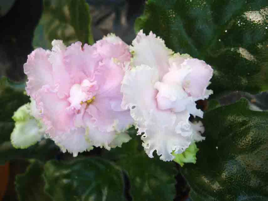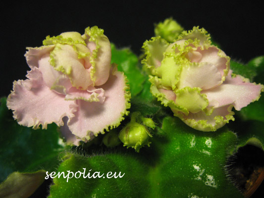 Полностью махровые крупные белые цветы с закрученной зеленой бахромой и розовым оттенком в центре. Гладкая шагреневая листва.