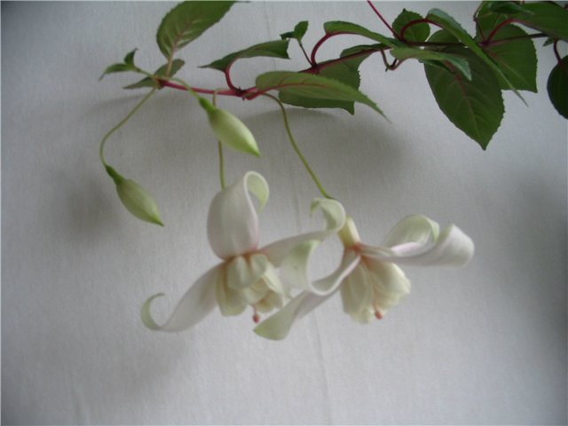 Девочки, спасибо вам всем за отклики! Теперь по сортам попробую вам показать какие у меня фуксии: Это сорт ANNABELL, заказывала этой весной в каталоге BAKKER. Сразу скажу, пришел самым жизнестойким, рос всё лето, зацвел только сейчас. Но цветки красивые, большие. Вот он: