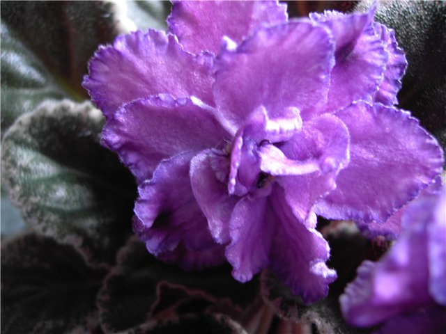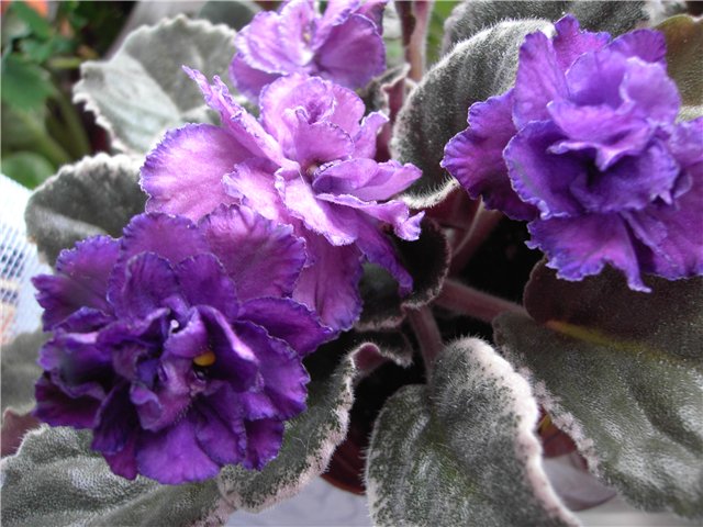 APACHE DAYDREAM (J. Munk) - Double red-plum large/darker frilled edge.Variegated medium green, white and pink. Standard. Махровые волнистые пурпурно-фиолетовые цветки с более темным тоном к краям лепестков и тонким прерывистым белым кантом. Пестрая листва. Цветки крупные и держатся долго, со временем немного светлеют.